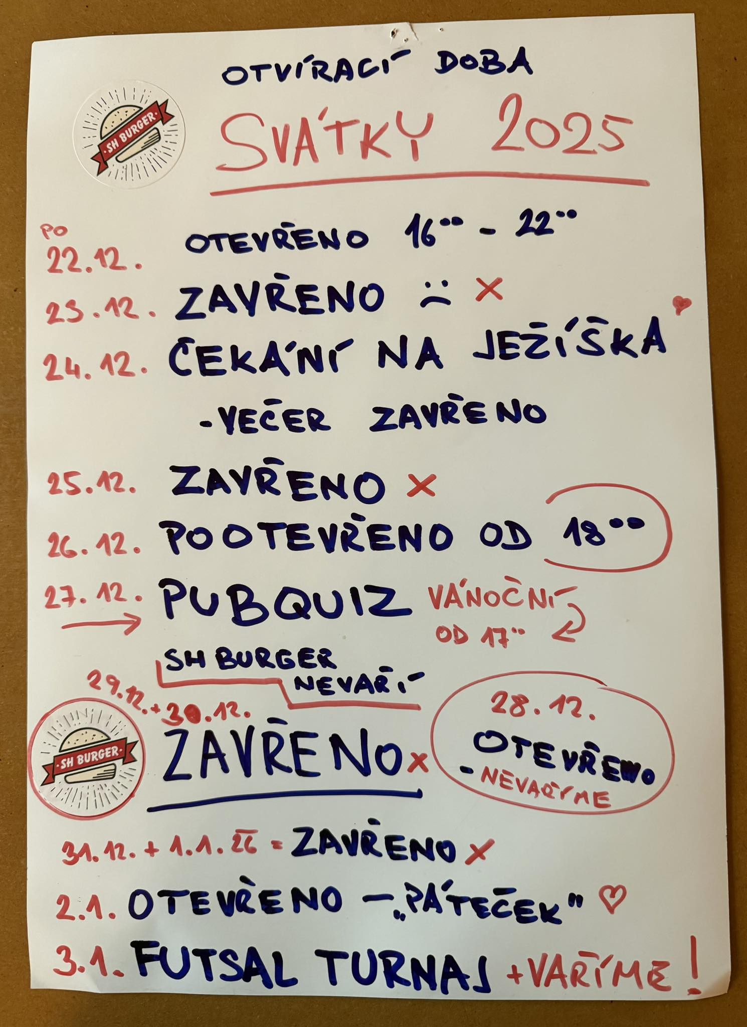 Od „Géčka“ a „Kozlika“ jsme se posunuli k mnohem kvalitnější nabídce piv od pivovaru Bernard a Pivovaru Strakonice. Stabilně u nás najdete taky dobroty od malého a velice sympatického pivovárku Nachmelená Opice a v roce 2024 jsme si dokonce začali vařit vlastní PiveSHko, který si velice rychle našlo svou cestu… Od sendvičů jsme se prokousali k jednoduchým nakládaným a grilovaným sýrům a steakům, naučili jsme se gulášků a flamendrů, abychom se nakonec dostali k tomu, co nám jde asi ze všeho nejlíp – k nabídce poctivých burgerů, tortill, XXL hot dogů a pečených mas, kterou vám teď budeme v různých podobách servírovat každý víkend na podzim, v zimě i na jaře!